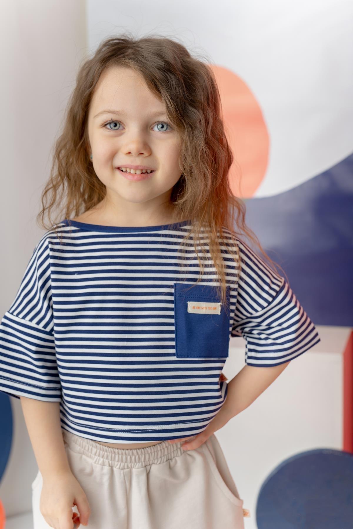 Kız Çocuk Lacivert Çizgili Çep Detaylı Crop T-Shirt