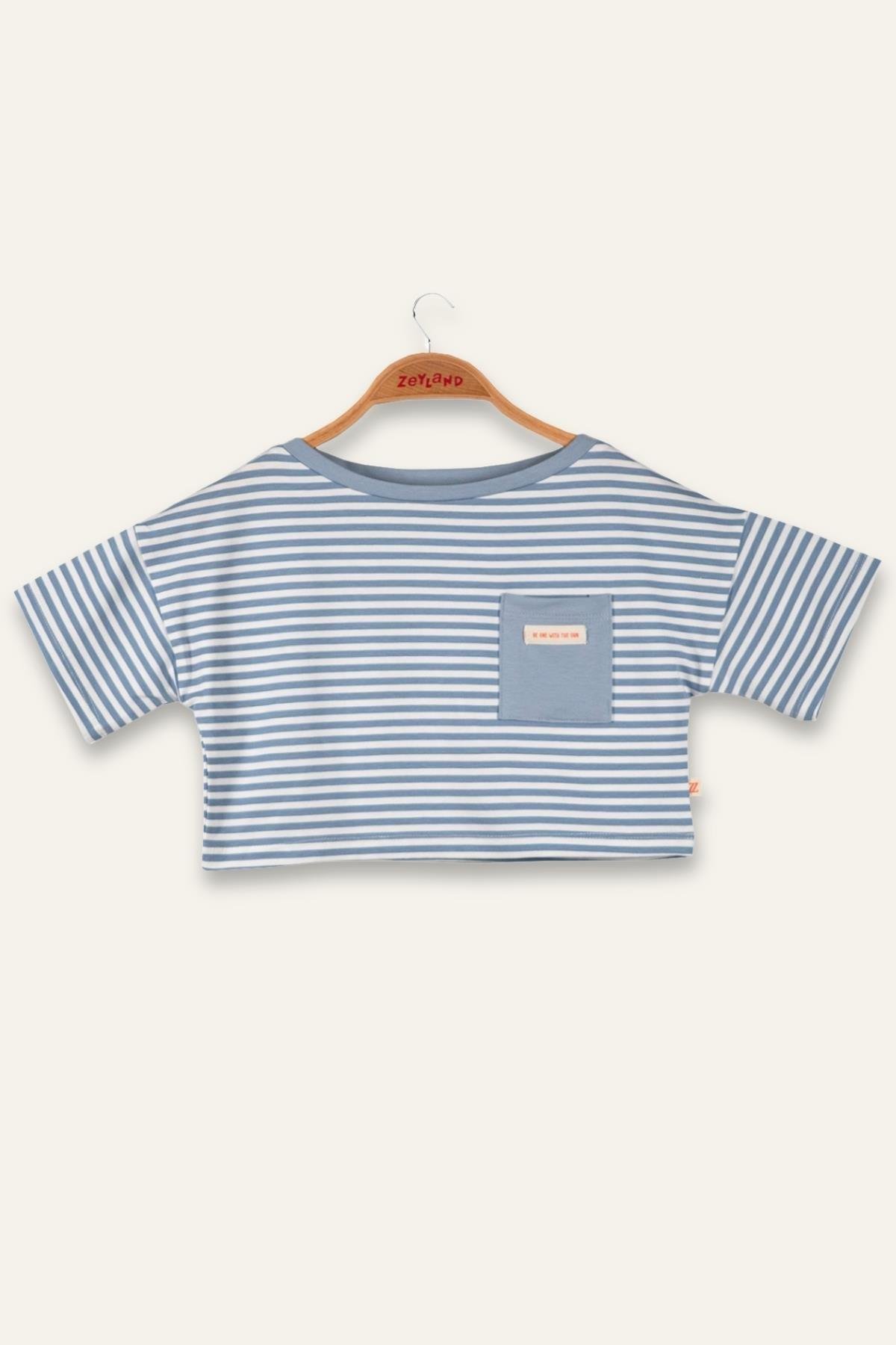 Kız Çocuk Mavi Çizgili Çep Detaylı Crop T-Shirt